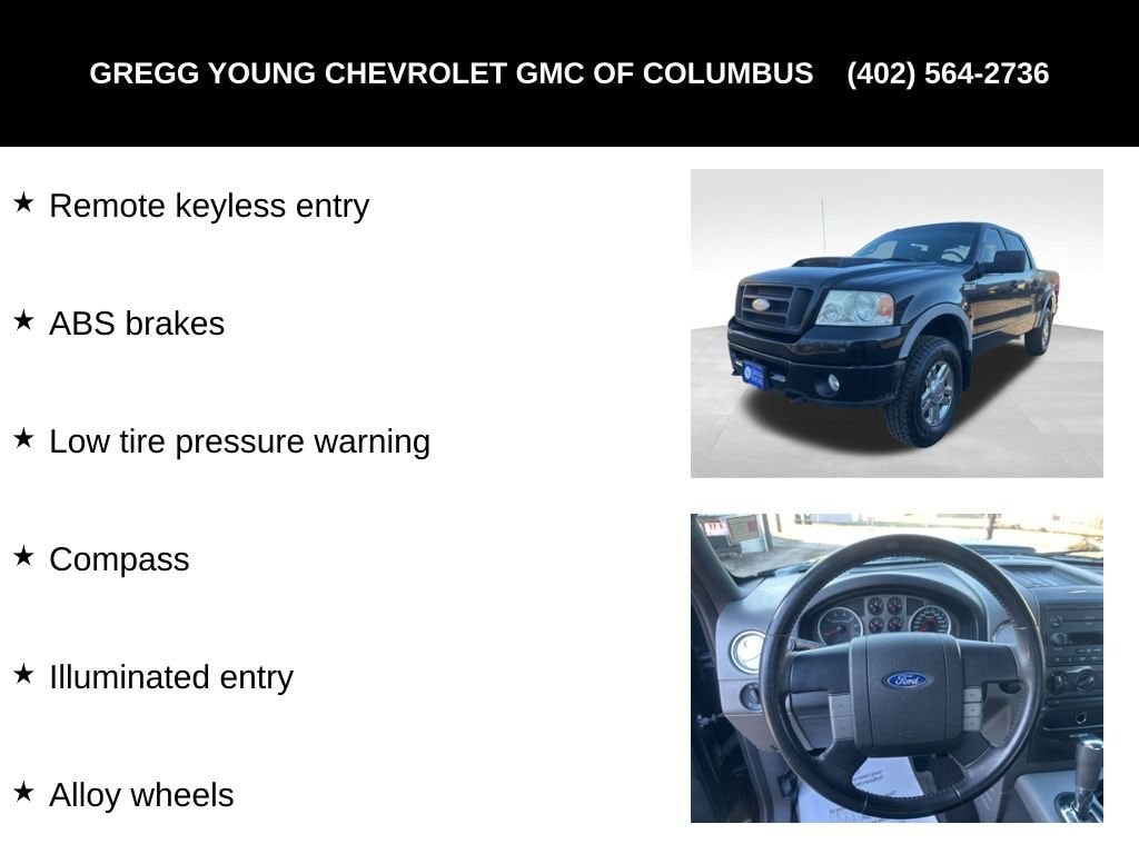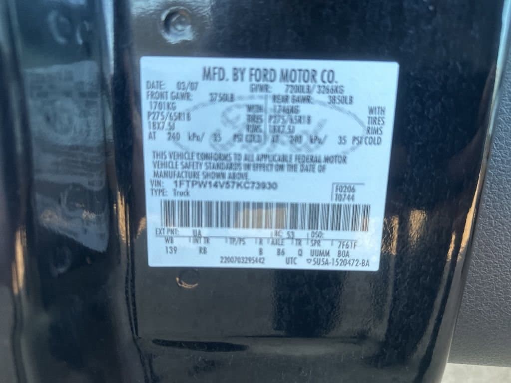 **2007**Ford**F-150**FX4**4WD**Running Boards**Bedliner**Our 2007 Ford F-150 FX4 SuperCrew 4X4 in Black is a great truck for mixing work and play. Powered by a 5.4 Liter V8 that delivers 300hp paired with a 4 Speed Automatic transmission. This Four Wheel Drive is ready to tackle any project with impressive towing capacity and rewards you with nearly 18mpg on the highway. This FX4 looks great while sporting a bold grille, fog lamps, hood scoop, running boards, bedliner and great-looking alloy wheels.Enter the FX4 cabin, sink into comfortable seats and enjoy the impressive audio system with CD player and auxiliary input, keyless entry, a leather-wrapped multifunction steering wheel, and power accessories.This Ford is filled with safety features to keep you, your family, and your cargo protected. Hit the road in safety and style thanks to multiple airbags, ABS, traction control, and more. This F-150 FX4 has all the comfort and capabilities you are looking for so hurry in today. Save this Page and Call for Availability. We Know You Will Enjoy Your Test Drive Towards Ownership!