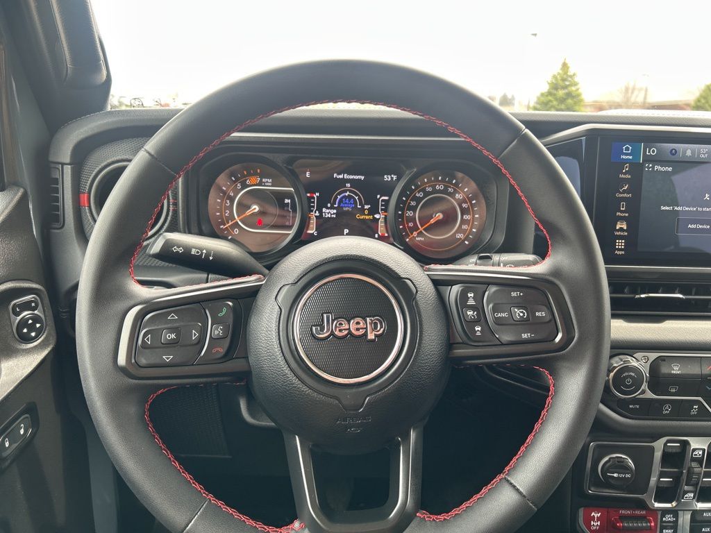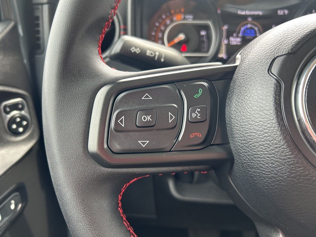 Ready for all your adventures, our Rubicon cabin boasts adjustable cloth seats, a premium-wrapped steering wheel, automatic temperature control, keyless entry/ignition, and convenient 12V/115V power outlets. Eye-friendly infotainment is at your service with a 12.3-inch touchscreen, a 7-inch driver display, voice command, Apple CarPlay, Android Auto, Bluetooth, and an eight-speaker audio system. Off-Road Info Pages let you track your trail performance, too!