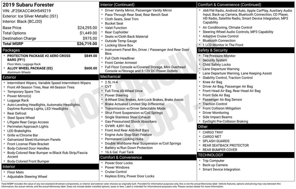 Our Accident Free 2019 Subaru Forester AWD in Ice Silver Metallic has been carefully designed with the features that are most important to you! Powered by a 2.5 Liter BOXER 4 Cylinder that offers 182hp connected to an innovative CVT for easy passing. This All Wheel Drive SUV rewards you with nearly 33mpg on the road, plus, with 8.7 inches of ground clearance, our Forester serves up a comfortable and capable ride even when road conditions are less than ideal. Functional and stylish, the brilliant design of this Forester helps you love every day's journey.